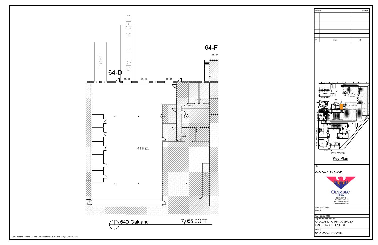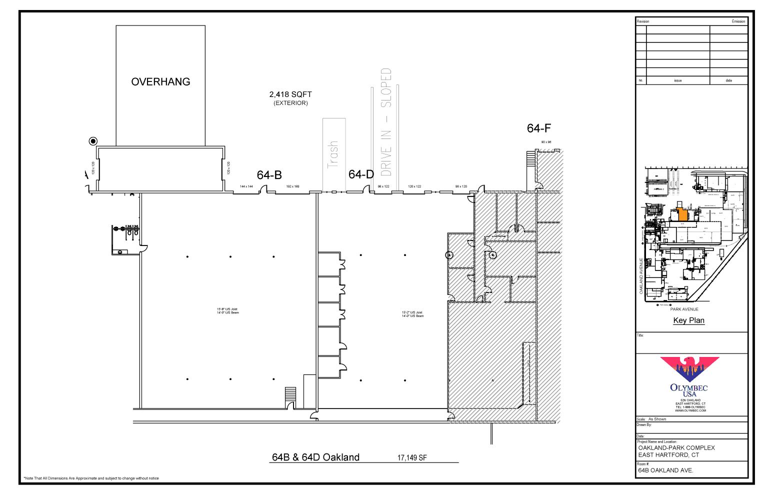 64B (10,094 SF) and 64D (7,055 SF) Oakland Avenue are two flex/industrial spaces available for lease in a large complex with additional spaces and configurations available. Both spaces can be leased individually or as one combined space. There is ample space for tractor trailers, and acres of additional paved parking available for lease. Location is extremely convenient with connections to I-91, I-84, and I-291.